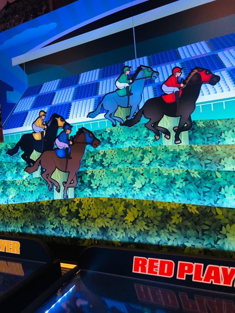 This ball is gently tossed down the “alley” to aim at one of the six holes in the base. Each of these holes involves different scores, depending on the complexity of their location in the alley. When the ball hits the hole, one of the horses at the top moves forward.