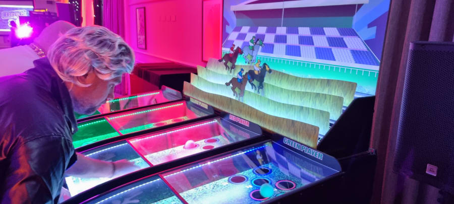 The roll and bowl Derby horse racing game has a built in PA system with full running commentary, sound effects along with LED lighting ensuring the atmospherics aren't horse play but make your event an excellent realistic experience that everyone will shout about.
