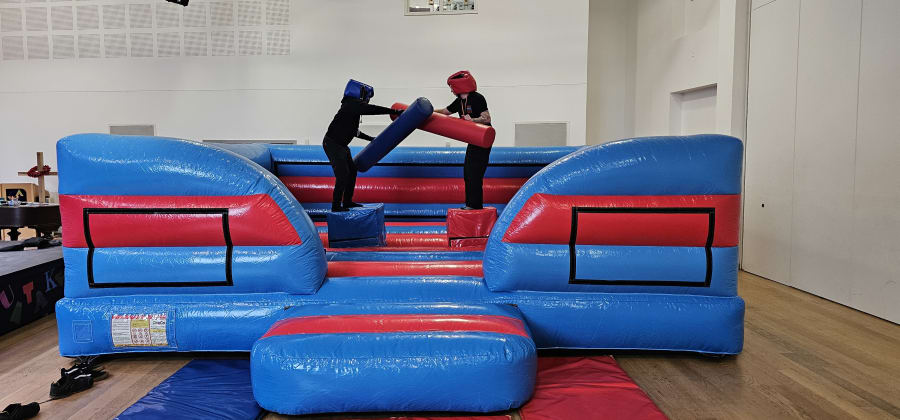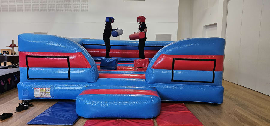 Gladiator duel game hire includes a top quality inflatable battle zone, to guarantee a soft landing when you get knocked down. You'll also get a pair of padded fighting sticks, just like the Gladiators on TV, plus a pair of head protectors to stop you getting hit too hard.