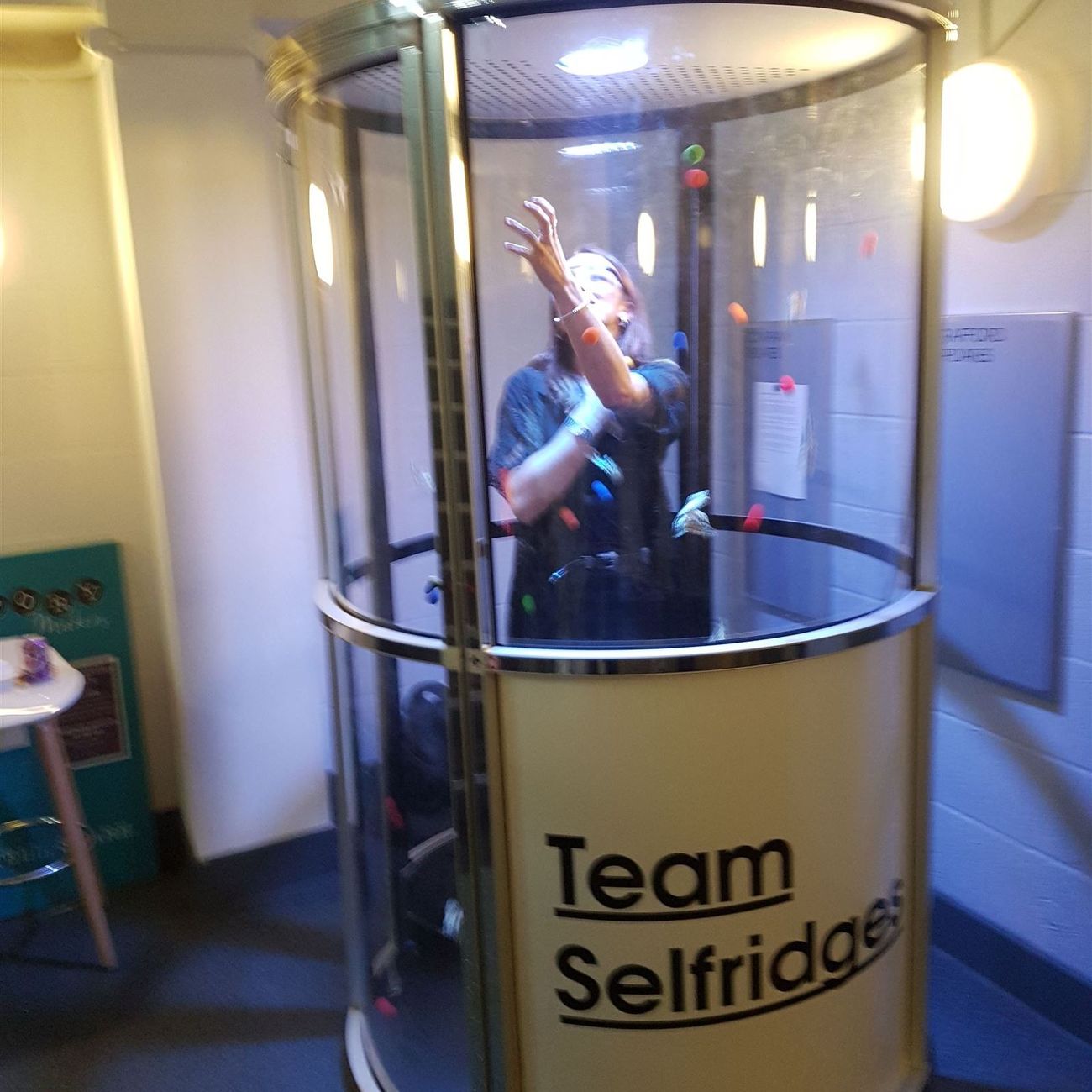 One participant enters the machine at a time, with timed sessions creating frantic entertainment for players and spectators.