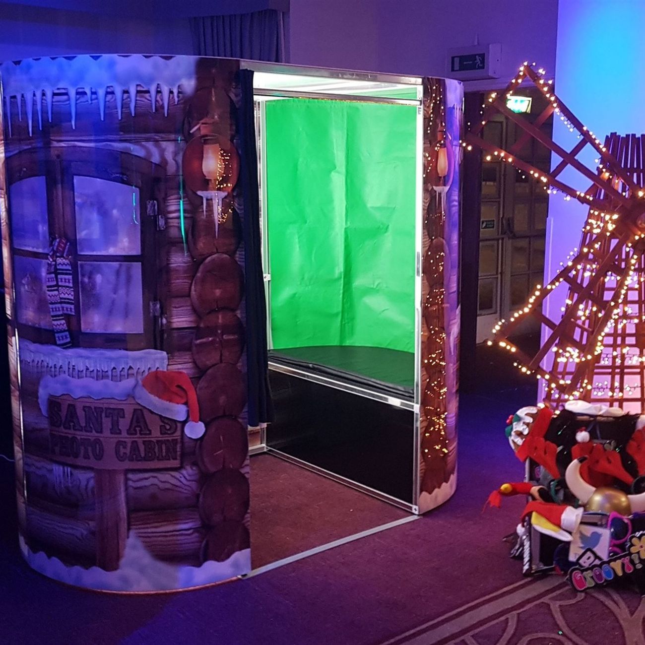 Please note that the Christmas photo booth cannot be carried up or down flights of stairs, so a lift is required if the setup location is not on the ground floor. The booth must be placed on a level indoor surface with at least one UK power socket within reach.
