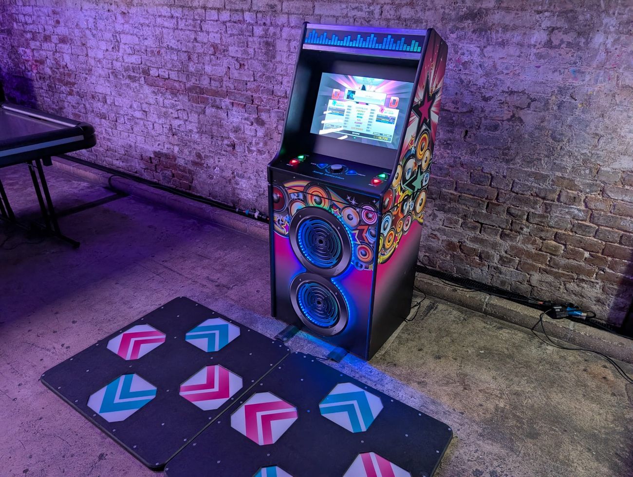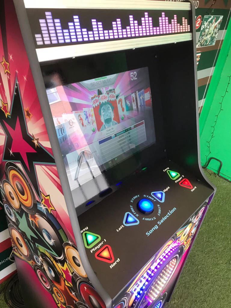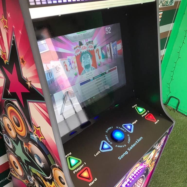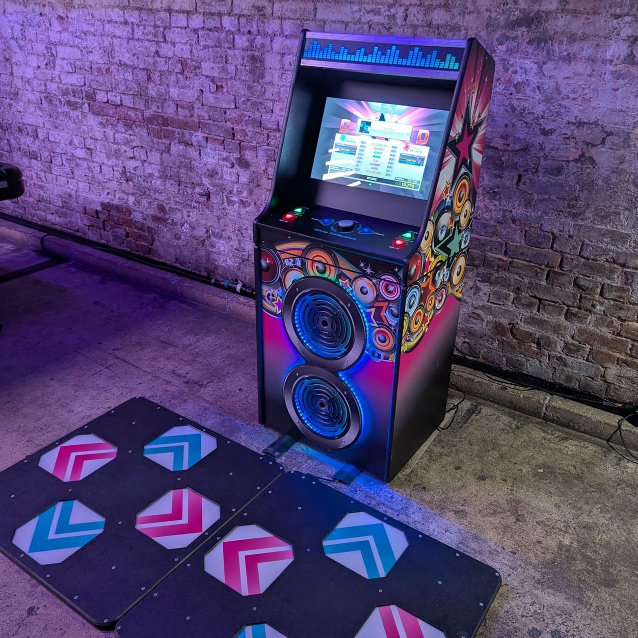 Get the party started with our Dance Machine hire. We offer the ultimate Dance Machine experience that will have your guests grooving all night long. Our Dance Machine hire includes an authentic retro arcade cabinet with a high-definition display screen, two arcade-style disco dance mats for a dance-off or side-by-side routines, a powered PA system, and ultra-bright colour change lights.