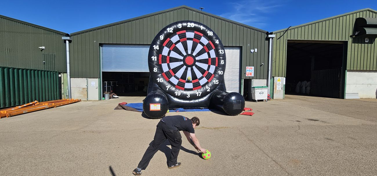 Participants kick a velcro football towards a giant inflatable dartboard target. The balls stick where they land using velcro, with points awarded based on the dartboard zones hit, just like traditional darts scoring.