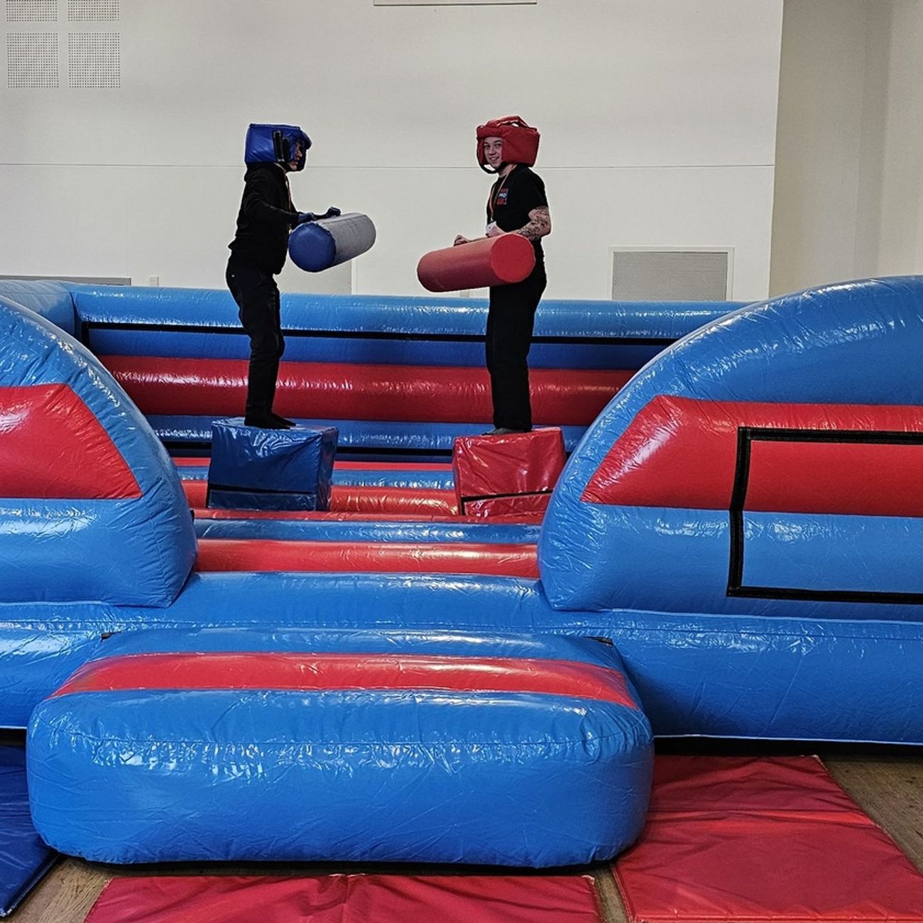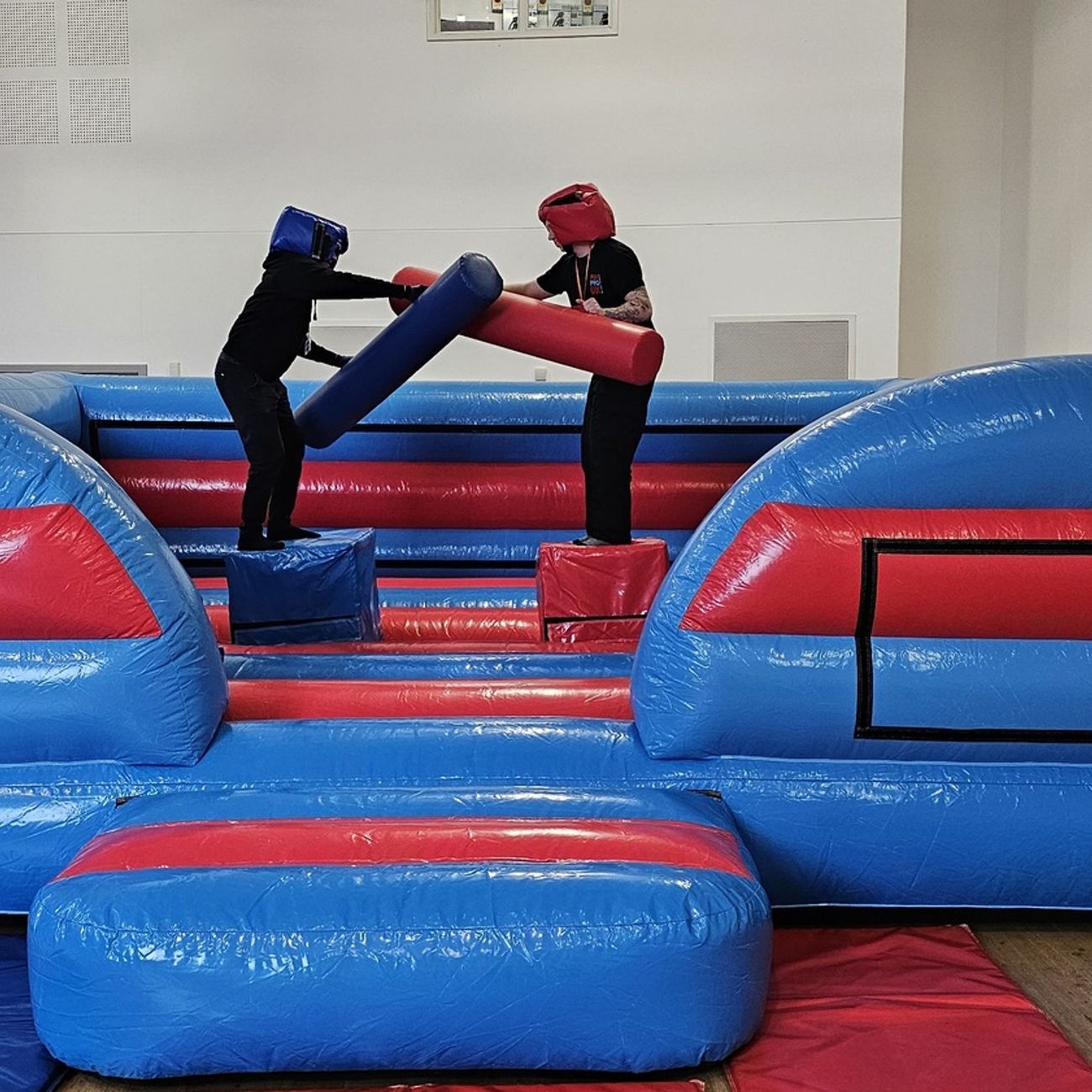 Gladiator duel game hire includes a top quality inflatable battle zone, to guarantee a soft landing when you get knocked down. You'll also get a pair of padded fighting sticks, just like the Gladiators on TV, plus a pair of head protectors to stop you getting hit too hard.