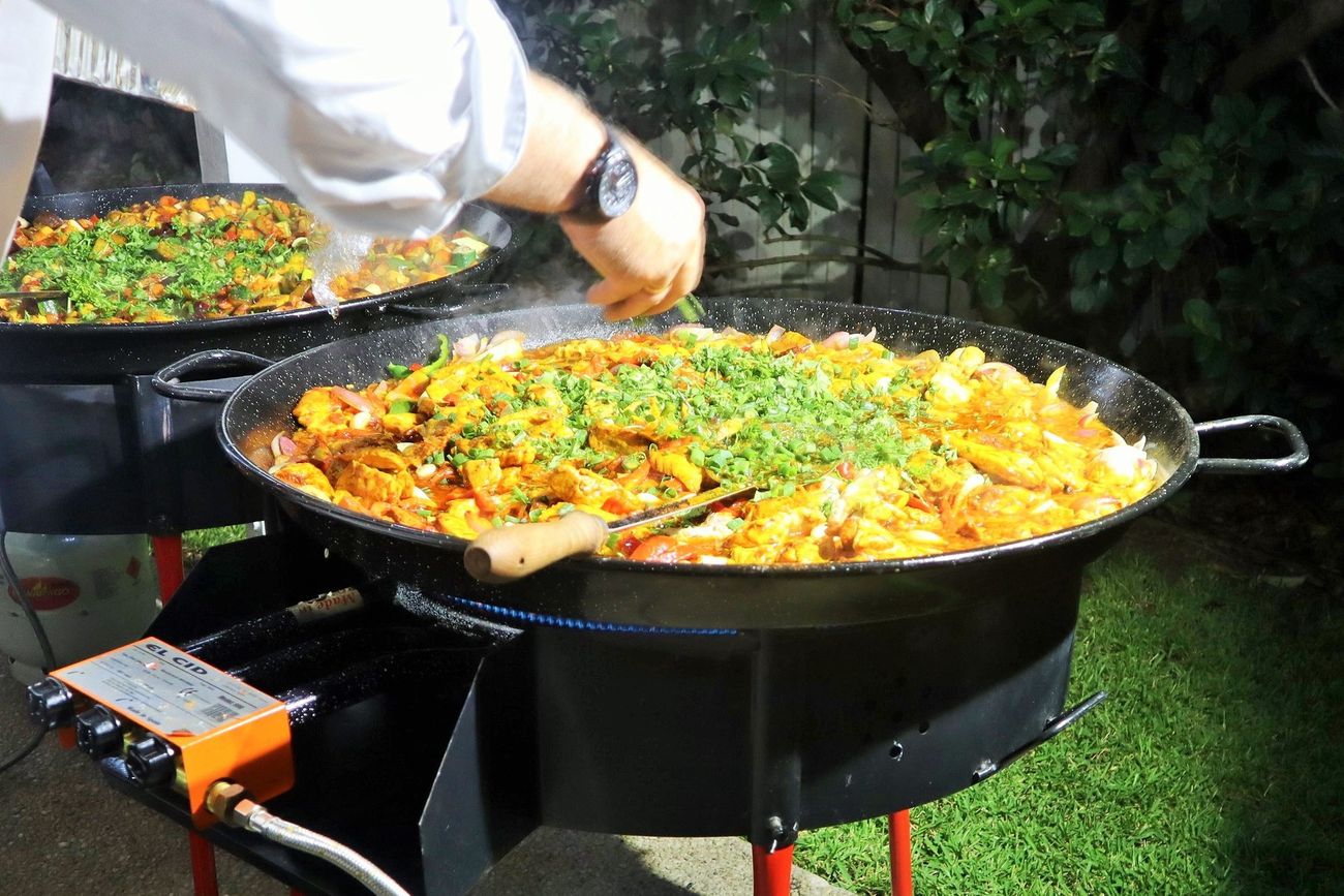 Paella works at events because it is inherently social food. The large pan, the communal serving, the gathering around cooking. It creates natural interaction in ways that individual plated meals simply do not achieve.