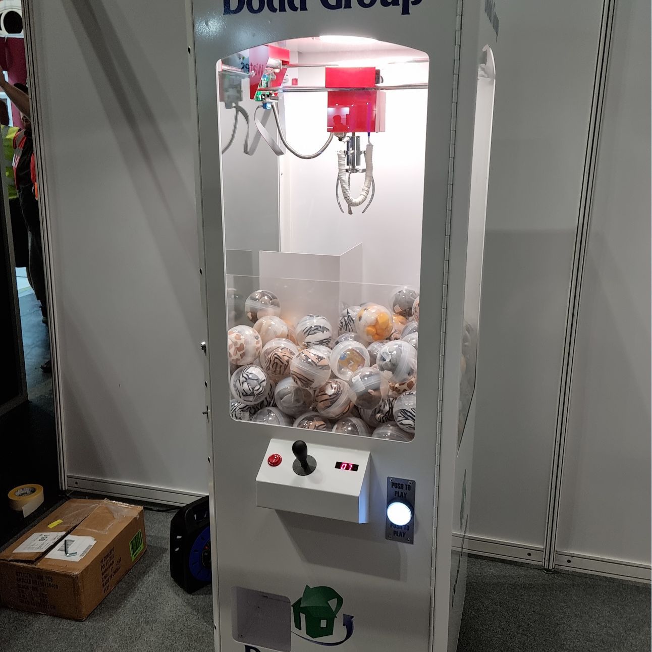 Each visitor uses the joystick to move the crane, then drops it down to grab onto a capsule. Once successfully captured, the crane lifts up and aims for the drop zone. The capsule is released, drops through the tunnel to the exit, and the player grabs it to see what they won. We suggest filling each plastic capsule with small items such as keyrings, stickers, badges, pins, or figurines.