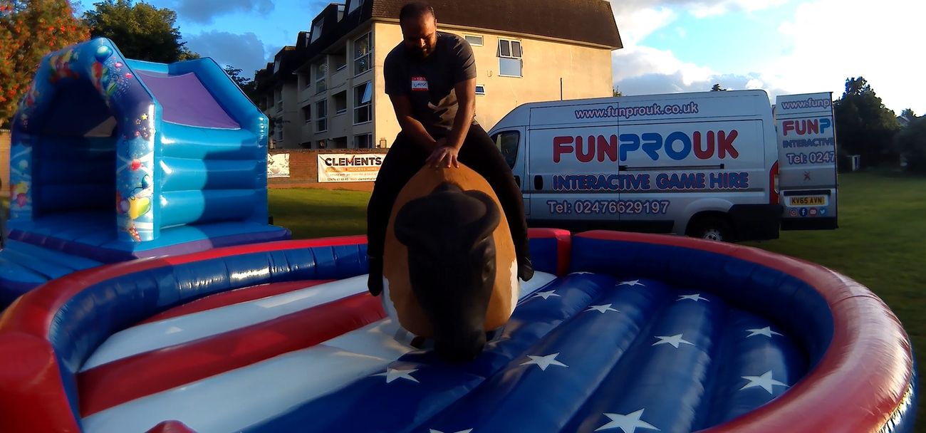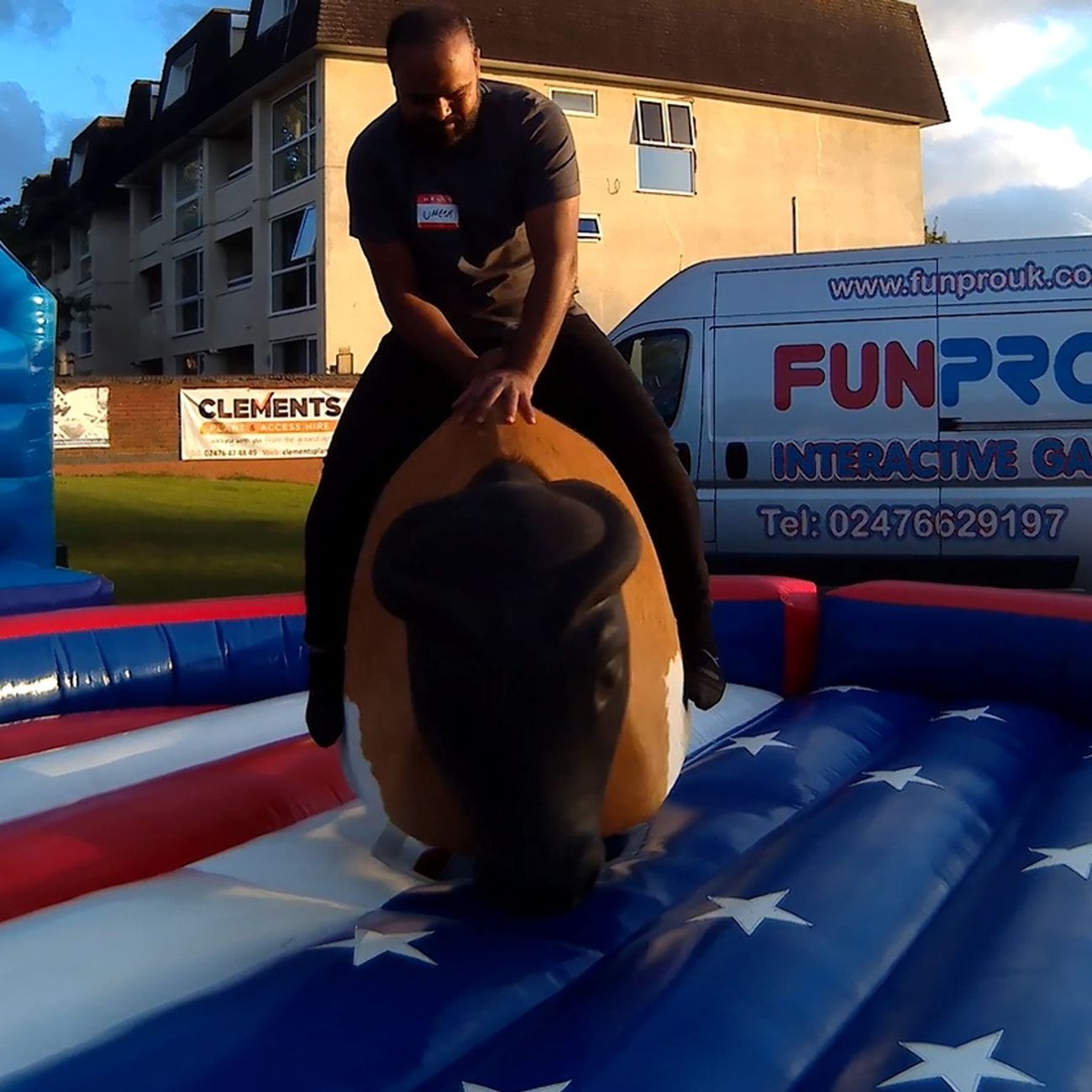 The player hops on top of the bull, holds on, the button is pressed, and the bull bucks and bounces you around while you try to hold on. You actually enter a circular inflatable pool with the bull in the centre, so if you lose control and fall off, there is a soft and spongy surface that will stop your fall, preventing any injuries.