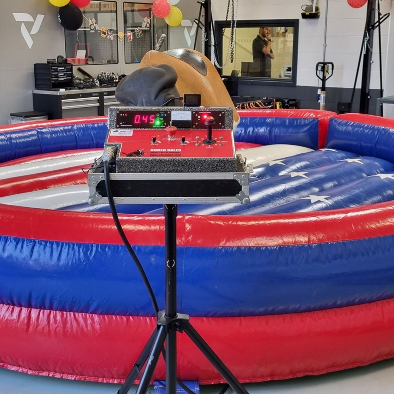 The rodeo bull suits ages 12 and above due to the physical nature. It's particularly popular with adults at corporate events.