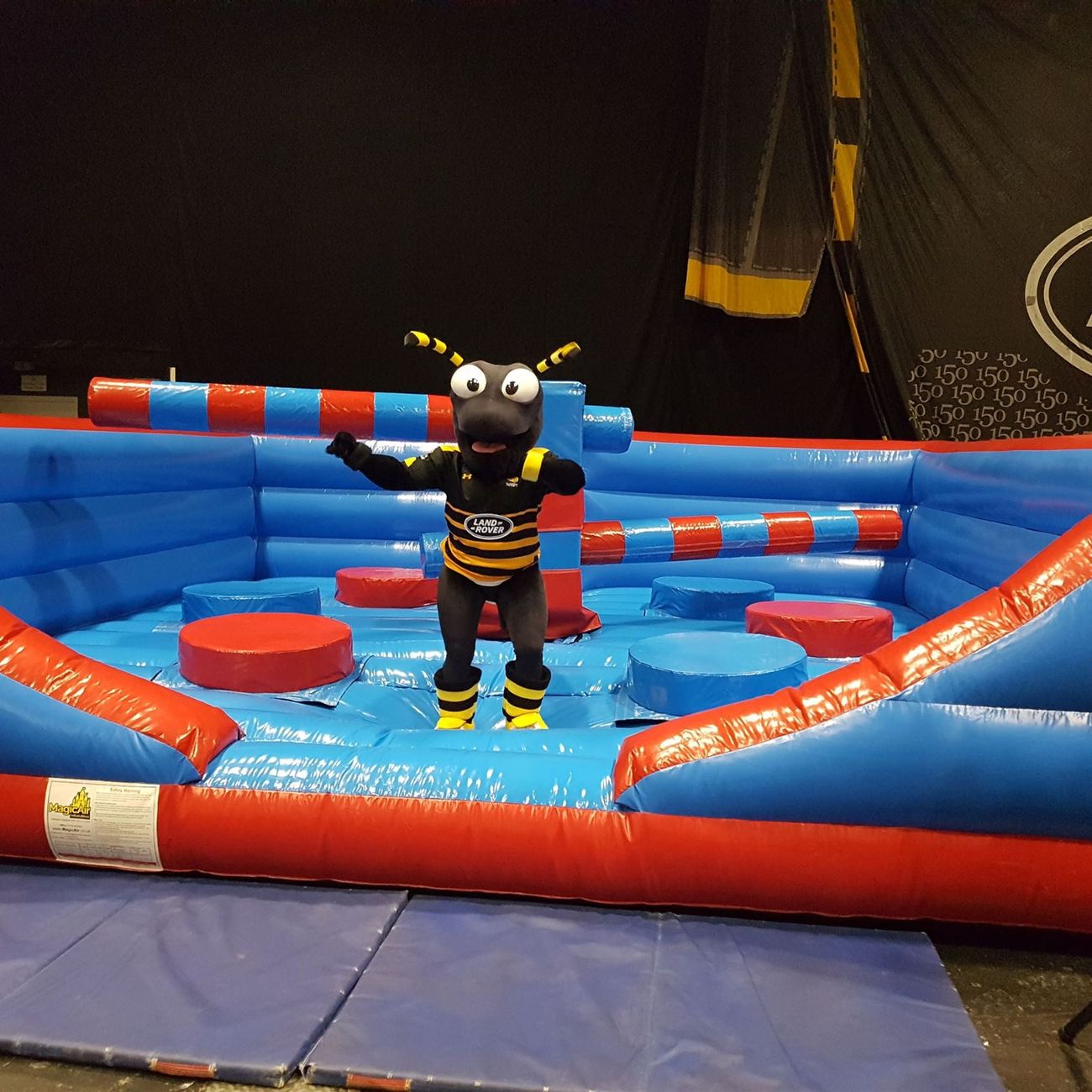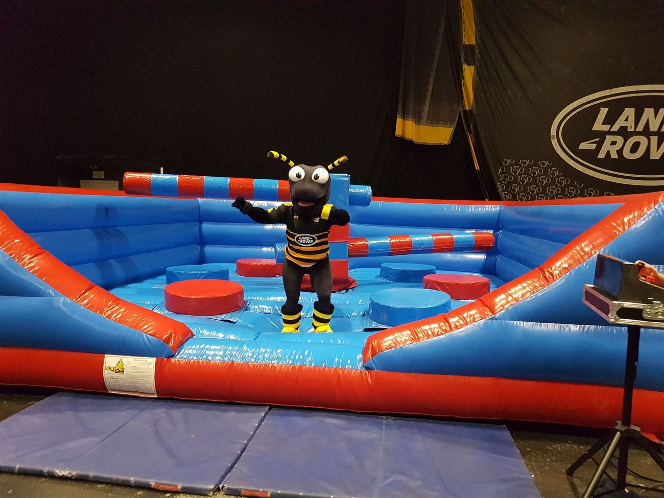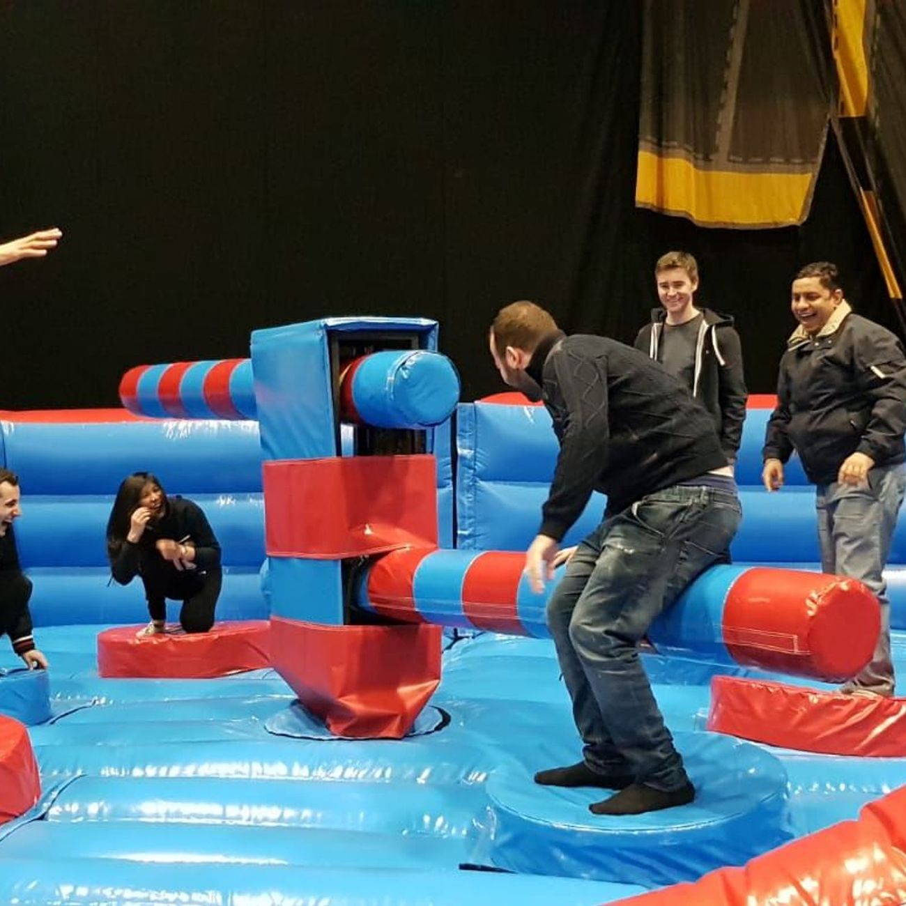The idea is simple: just jump or duck as the two arms swing past, to avoid getting knocked off your podium. But don't worry if you do get dislodged, because there's a soft landing guaranteed on our squidgy inflatable floor. Each person stands on a small circular platform, and the game is played until there is only one person left standing.